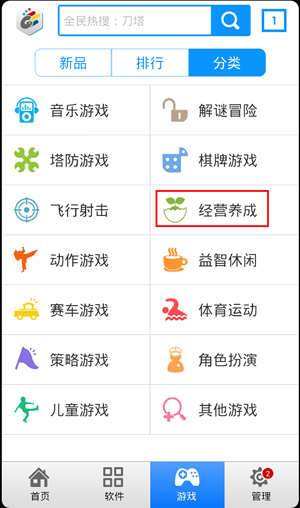 在分類游戲這一界面中,點擊經營養成游戲這一欄,如圖:
