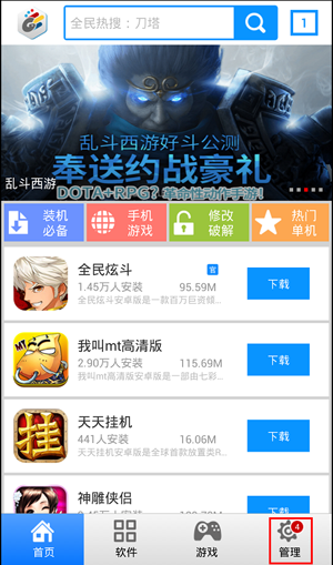 在進入到軟件首頁精選頁面中,可以發現統一安卓助手將軟件分為了首頁、軟件、游戲和管理四個部分,點擊管理軟件,如圖: