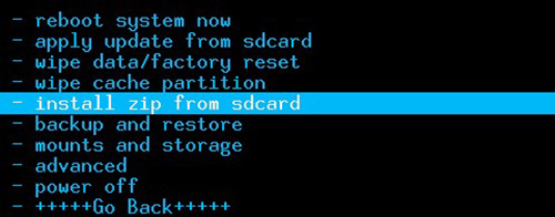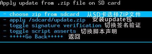 3)接下來就是開始刷入zip格式的刷機包了,按音量鍵選擇install zip from sdcard確認,然後再按音量鍵選擇choose zip from sdcard,然後確認,接下來按音量鍵移動光標找到之前放入SD卡根目錄的刷機包,然後選擇Yes – Install XXXXX.p-確認開始刷機。