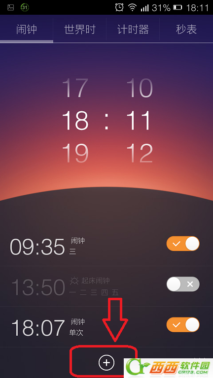 1.在手機桌面上找到時鐘,進去之後在鬧鐘的右邊有個“+”符號的,點擊一下。如下圖: