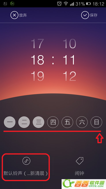 2.然後會出現時間供你設置,時間就是鬧鐘的時間,可以自己隨便選擇幾點幾分,別忘了選擇設置時間的日期(圖中劃線處)和鈴聲(圖中框處),如圖: