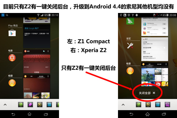 這裡還需要提醒的是,奢侈的“一鍵關閉後台”功能僅限Android 4.4版本的Xperia Z2所擁有,與Z2同時發布的Xperia M2、Xperia T2新機型都不具備此功能,而且把Xperia Z1或者Z1 Compact升級到官方Android 4.4版本,也沒有出現“全部關閉”按鈕。如果你是一個骨灰級的索尼強迫症用戶,千萬記得暫時只有Z2有此功能,Z1和Z1 Compact升級是沒有這個功能的。咱就不批評了,希望以後會有更新吧!