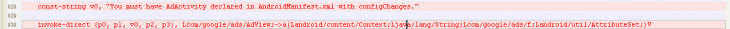 接著進入F:apktoolAAsmalicomgoogleadsAdView.smali我們只要找到剛剛在AndroidManifest.xml刪的廣告代碼和在這的對應廣告代碼刪除。