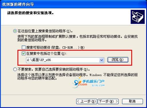 接著通過“浏覽”找到下載好的驅動所在的文件夾(這裡以Windows XP系統x86芯片為例)。
