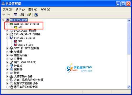 驅動安裝完畢後,就可以看到“設備管理器“中Android USB設備的黃色感歎號已經去掉。
