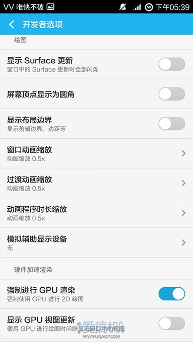 動畫速度統一調0.5x(默認1.0x),這樣會明顯感覺動畫過度更加迅速,當然更強迫症的用戶可以直接選擇關閉,反應會更加快。強制GPU渲染建議還是打開吧,也能顯著提升流暢度(尤其是高分辨率的設備),部分品牌甚至會把這些選項隱藏(這裡就不點名了),簡直就是反人類啊,有木有?