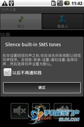 運行軟件後,我們會發現主界面分為默認和聯系人兩個標簽,默認標簽下可以設置基本的鈴聲和短信鈴聲,點擊下拉框,首次運行可能會有確認提示,直接點確認跳過。
