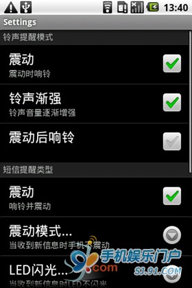 在界面中點擊高級設置,可以進行震動、LED閃光、鈴聲堅強、短信是否彈出顯示等多項個性化功能,足夠滿足日常需求。
