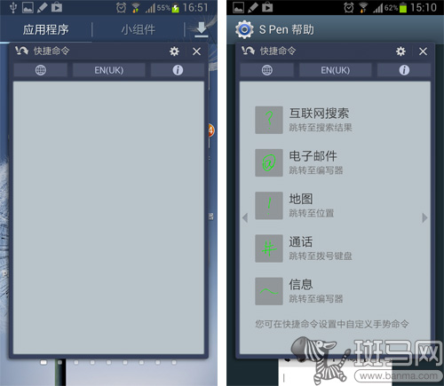 進入應用首先可以看到默認設置好的一些S-Pen手勢命令,在包含了系統原有的手勢命令之外,還多出了很多實用手勢,比如:“v”可以在屏幕中間呼出一個可自定義的快速啟動欄(LaunchPad);從屏幕底部向上劃則會呼出近期運行的應用列表;從屏幕中部向上劃等同於按下HOME鍵;左右滑動則可以切換前一個或者後一個執行的應用程序等等。