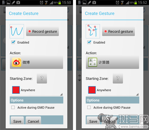設置完成後,點擊“Save”保存就可以了。只要該應用處於運行狀態,那麼通過剛才設置的手勢命令就可以快速激活手機應用或者相應系統功能。下面是小編設置的微博和計算器的快速啟動手勢,實際使用中體驗非常不錯。