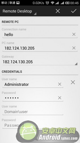 添加網關,第一行網關名直接填寫電腦IP,第二行也填寫電腦IP。第三行user name填Administrator,第四行password(密碼)填入自己電腦上的密碼。ok點擊右上角對號保存。