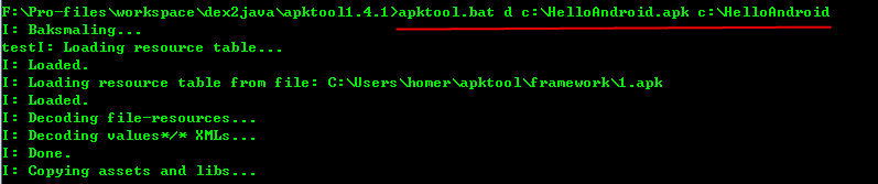 上圖中,apktool.bat 命令行解釋:apktool.bat d -f [apk文件 ] [輸出文件夾]