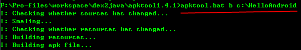 將反編譯完的文件重新打包成apk,很簡單,輸入apktool.bat b abc123(你編譯出來文件夾)即可,命令如下: