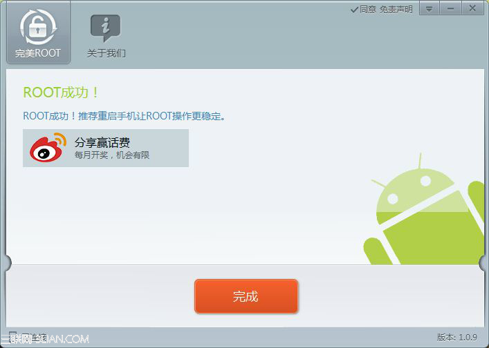 等待1-2分鐘,三星note3完美root軟件結束運行,彈出“ROOT成功”頁面,不用懷疑,你的三星note3 n9006已經成功一鍵root!現在點擊“完成”,等待手機重啟吧!