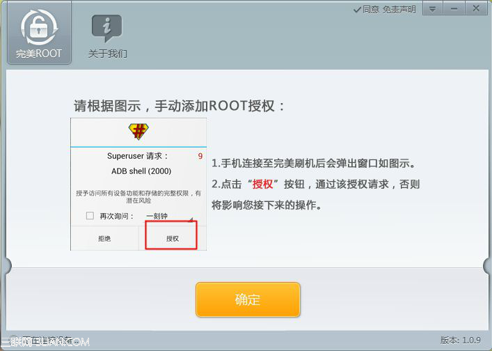 另外,點擊“完成”按鈕後,軟件彈出溫馨提示頁面,見下圖,按照頁面提示操作,即手機界面出現Superuser請求,點擊“授權”,完成手動添加三星note3 n9006 root權限!