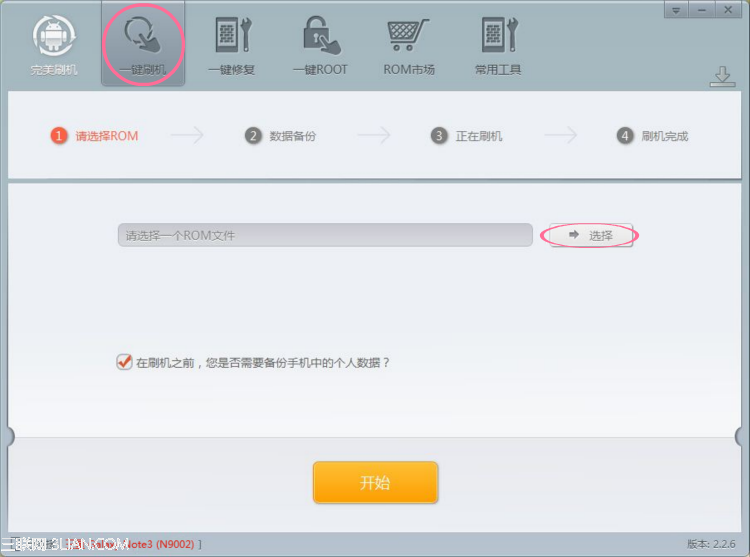 方法二:如果自己准備三星n9002刷機包,點擊頁面上方的“一鍵刷機”,進入下圖所示頁面,點擊“選擇”,成功導入准備好的刷機包,點擊“開始”,軟件立即運行三星note3 n9002刷機。