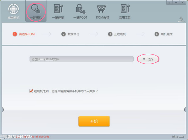 方法二:如果你已經准備好三星note3 n9008刷機包,直接點擊頁面的“一鍵刷機”,進入下圖所示頁面,點擊“選擇”,成功導入你自己的刷機包後,點擊“開始”,軟件立即運行三星note3 n9008完美刷機。