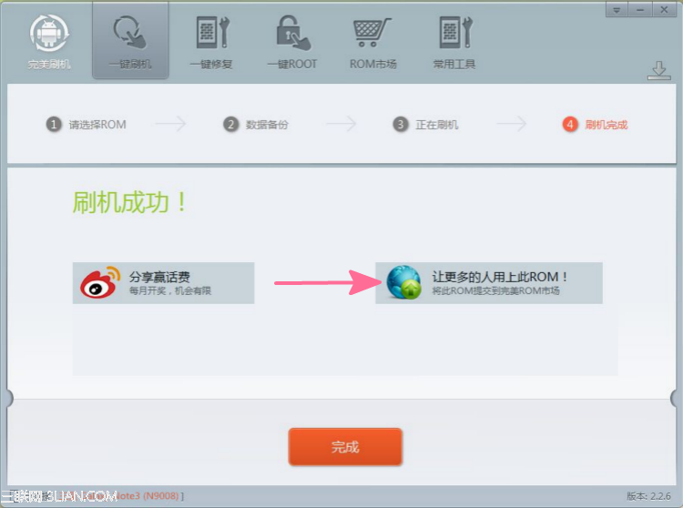 三星note3 n9008刷機成功後,機友們還可以分享自己的刷機包,點擊“刷機成功”頁面右邊的“讓更多人用上此ROM”,直接跳轉到完美ROM市場,填寫ROM相關信息就行!三星note3移動版n9008怎麼完美刷機?看完這篇教程相信大家已經掌握了刷機步驟,一起來體驗一下這種簡單的三星 note3 n9008刷機方法吧!