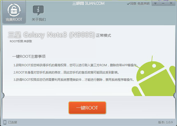 Root軟件成功連接三星n9005後,直接進入三星note3 n9005一鍵root頁面,現在看頁面的“一鍵ROOT注意事項”,之後直接點擊“一鍵ROOT”選項,軟件正式開始三星note3 n9005完美root!
