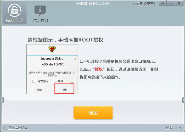 另外,點擊“完成”後,軟件彈出提示頁面,見下圖,完成手動添加三星note3 n9005 root權限,即手機界面出現Superuser請求,點擊“授權”選項!