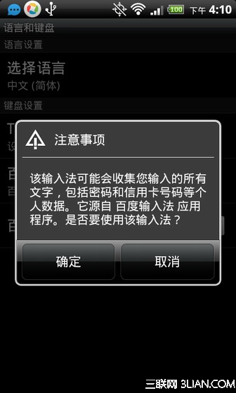 系統自帶的輸入法一般默認都是全鍵盤的,也就是大家平時說的QWERTY鍵盤,想要設置為傳統的按鍵鍵盤的話則需要一些設置,這個跟新裝了輸入法之後的設置類似,所以我們把2個操作放在一起講。現在比較好用的輸入法有百度輸入法、搜狗輸入法等,還有可以語音輸入的訊飛語音輸入法。這裡以百度輸入法為例講解,安裝百度輸入法,安裝好之後進設置(按menu鍵,選擇設置),選擇【語言和鍵盤】,然後會看到輸入法選擇的界面,如下圖