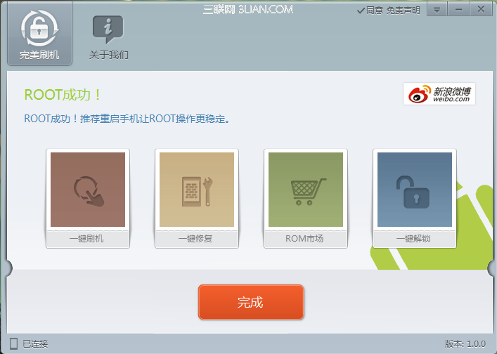 三星i739 root軟件運行過程相當迅速,大概1-3分鐘,你就會看到軟件界面切換為“ROOT成功”,這時軟件已經成功獲取三星i739電信版root權限!等待手機自動重啟吧,中途不要拔掉數據線。