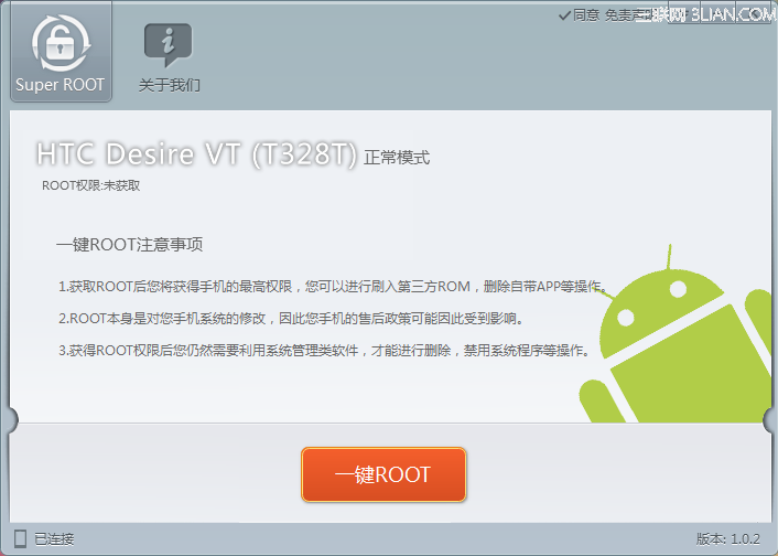 HTC t328t手機root教程請機友們注意:“一鍵ROOT注意事項”為必讀項,如果你的手機沒有安裝驅動,完美ROOT工具會自動進行安裝,按照頁面提示操作即可!