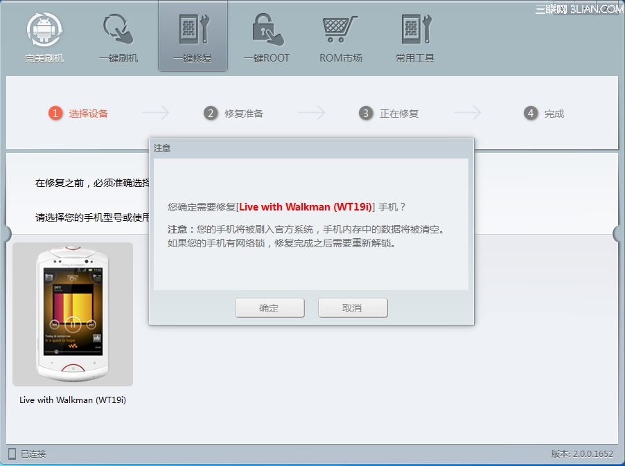 連接上手機和電腦,打開完美刷機變磚修復功能,選擇索尼系列手機救磚並確認修復。在這裡告訴您修復後手機回到官方初始狀態,數據被清空,還需重新解鎖等內容。確認修復請點擊確定。