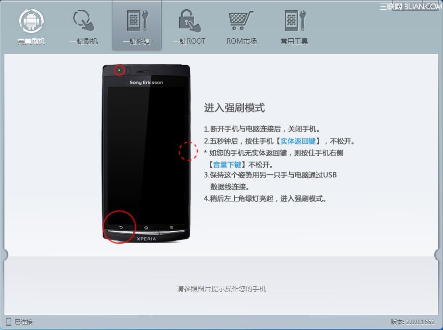1.斷開手機與電腦的連接,關閉手機。2.五秒鐘後,按住實體返回鍵不松手,手機無此鍵就按住音量下鍵。3.保持這個姿勢,然後用另一只手連接USB線。4.左上角綠燈亮起則進入強刷模式。