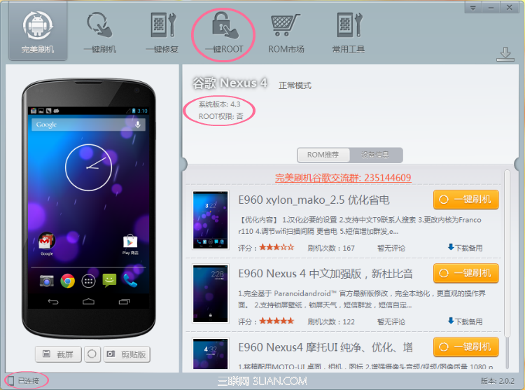 雙擊完美刷機圖標,啟動軟件,用數據線連接nexus4和電腦,確認手機已經與軟件成功連接後再繼續下面的操作。