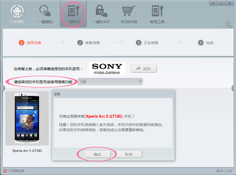 切換到救磚頁面後,出現軟件目前支持的手機品牌,點擊“SONY”按鈕,出現索尼系列手機,在搜索框內輸入機型,例如“18i”,篩選出索尼lt18i圖標,軟件此時彈出一個對話框,詢問你是否要進行救磚,選擇“確定”。