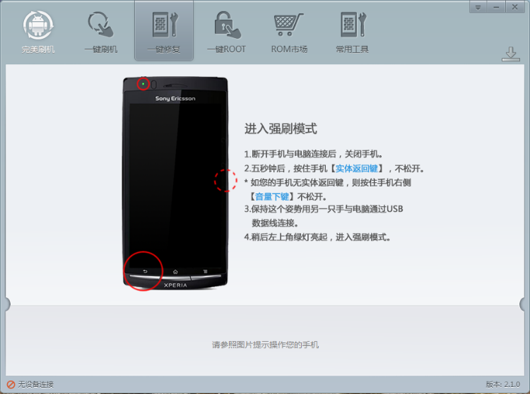 安裝好軟件後,雙擊軟件圖標啟動軟件,之後用數據線連接索尼lt18i和電腦,點擊頁面上方和下方的“一鍵修復”按鈕切換到救磚頁面,軟件頁面如下圖所示:
