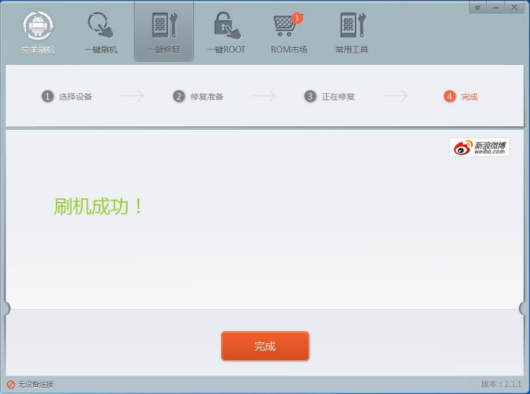 軟件進度條推進到“完成”自動切換為修復成功頁面,根據頁面提示操作,點擊“完成”,手機啟動成功標志索尼mt27i救磚結束。