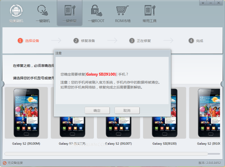 在搜索框裡輸入手機型號,點擊搜索到的“Galaxy S2(i9100)”圖標。點選機型後,頁面彈出一個對話框,確認是否要對三星i9100進行救磚,選擇“確定”。