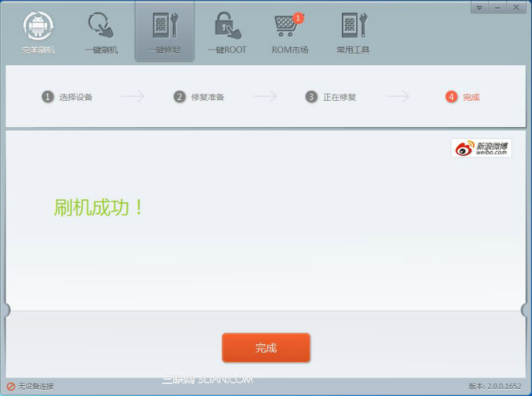 救磚工具的修復進度條向前推進到“修復完成”,軟件自動彈出“修復成功”頁面,請點擊“完成”!之後,等待手機自動重啟!第一次開機時間會比較長哦!
