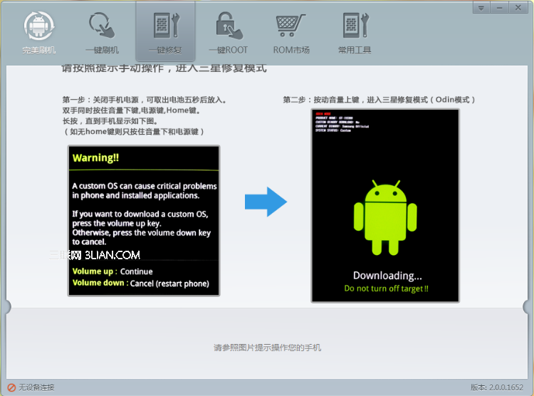 雙擊軟件圖標,啟動救磚工具,數據線連接三星i9300和電腦,按照三星Galaxy s3 i9300變磚修復教程繼續操作,下面點擊頁面上方或下方的“一鍵修復”按鈕均能進入救磚頁面。
