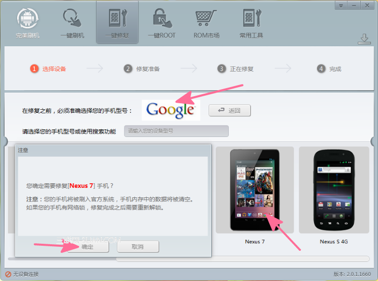 切換到救磚頁面後,在眾多手機品牌中選擇“Google”按鈕,選擇“”圖標,點擊後彈出對話框,詢問你是否要對谷歌Nexus 7進行變磚修復,點擊“確定”。