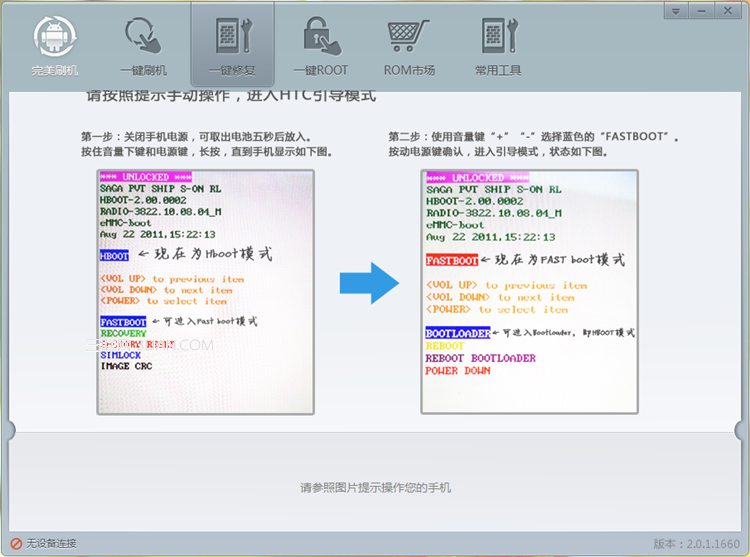 HTC One X救磚教程進行到這裡,軟件會提示需要手動進入引導模式,具體步驟見下圖。