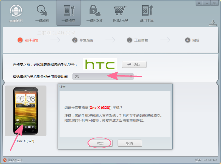 點擊頁面上方的“一鍵修復”按鈕,這時需要選擇手機品牌,點擊“HTC”切換到救磚頁面,在搜索框內輸入手機型號,如輸入“23”,點擊圖標,在彈出的確認是否要進行HTC One X救磚的對話框內選擇“確定”。