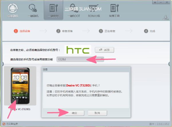 切換到“一鍵修復”頁面後點擊“HTC”圖標,HTC救磚頁面出現各個機型手機,在搜索框裡輸入手機型號,如“t328d”,點擊搜索到的“Desire VC(T328D)”圖標。點選機型後,頁面彈出一個對話框,選擇“確定”,確認進行HTC t328d救磚。