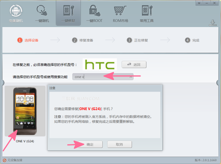 點擊救磚頁面“HTC”圖標,進入HTC救磚頁面,出現HTC各個機型,在搜索框裡輸入手機型號,如“one v”,點擊搜索到的“one v(G24)”圖標。點選機型後,頁面彈出一個對話框,確認是否要進行HTC one v救磚,選擇“確定”。