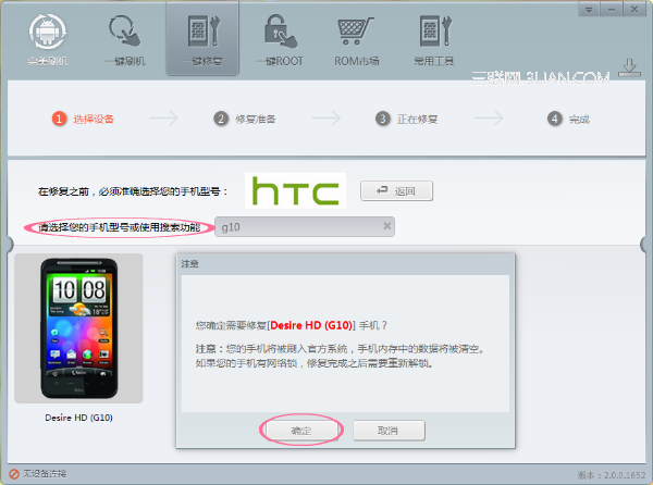 點擊救磚頁面“HTC”圖標,進入HTC救磚頁面,出現HTC各個機型,在搜索框裡輸入手機型號,如“g10”,點擊搜索到的“HTC g10(Desier HD)”圖標。點選機型後,頁面彈出一個對話框,確認是否要進行HTC g10救磚,選擇“確定”。