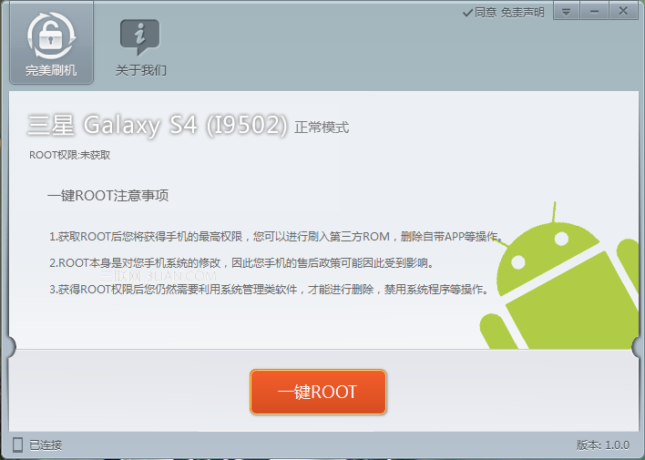 完美ROOT工具安裝到桌面後,雙擊圖標啟動軟件,軟件成功連接手機後會自動切換到三星s4 i9502 root頁面。不管你是三星i9502 root小白還是老手都請你認真閱讀頁面上的“一鍵ROOT注意事項”,對手機完成root後的相應情況有所了解。