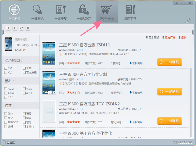 除此之外,你還可以直接點擊主頁面上方“rom市場”按鈕,搜索中意的三星i9300刷機包下載進行刷機。
