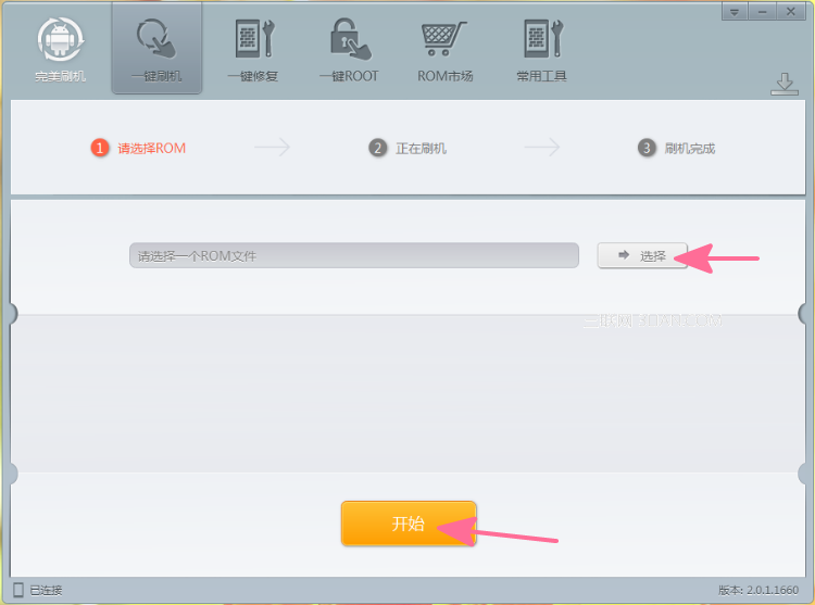 途徑二:如果刷機之前你就已經准備好HTC g17刷機包,請直接切換至“一鍵刷機”頁面,點擊“選擇”,選定你已經准備好的rom包,點擊頁面下方的“打開”即可完成導入rom包的操作。將rom添加到主頁面的選項框後,點擊“開始”HTC g17刷機軟件立即運行。