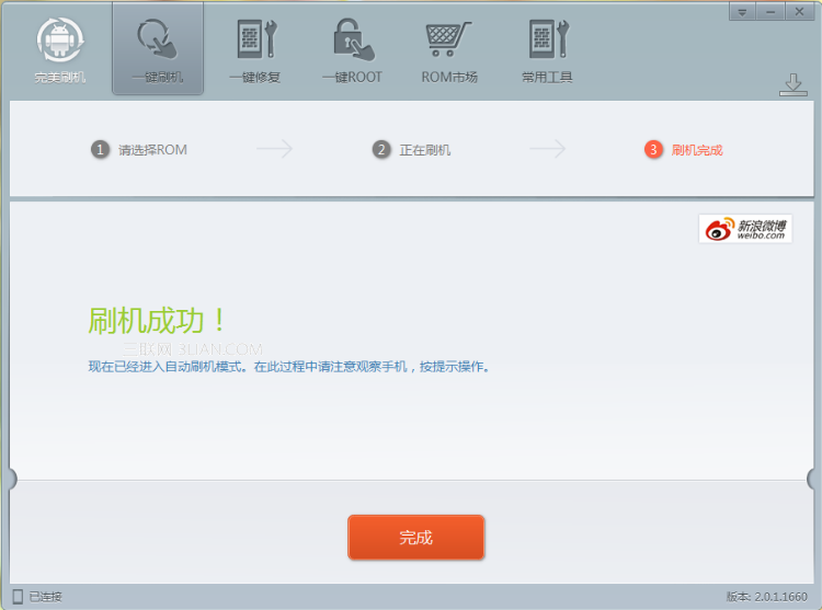 當刷機軟件此時頁面如下圖所示時表示這是HTC g13刷機教程最後一個步驟,刷機軟件已經完成HTC g13刷機工作,請點擊“完成”。