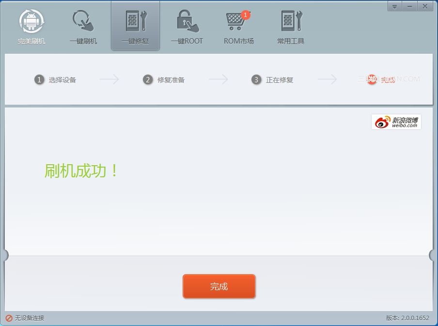 刷固件的過程需要運行一段時間,耐心地等上5-10分鐘,在等待的過程中,還要留意觀察手機的變化,固件刷到100%,顯示修復成功時,之前的三星I777變磚手機就會重新開機了。現在請點擊完成按鈕,關閉軟件。