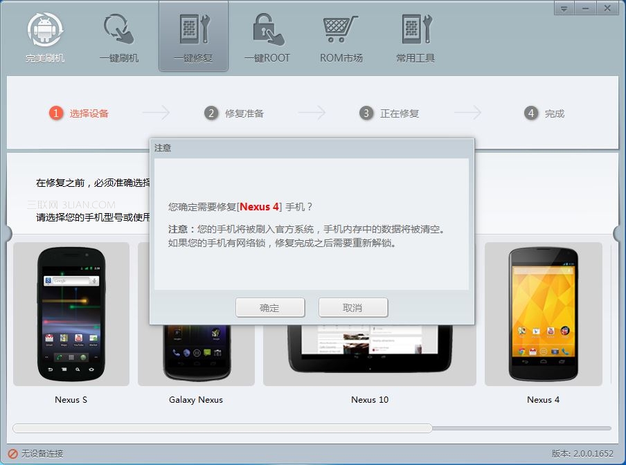 先用數據線插上手機與電腦,讓完美刷機軟件連接LG E960變磚手機設備。並選擇好與谷歌Nexus4相對應機型確認修復。