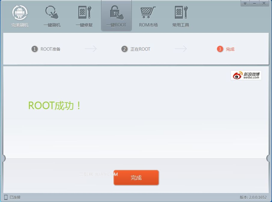 點擊完成,一鍵root完成了。出現成功就代表你已經成功的獲取到最高權限了,也意味著您一鍵root成功了。之後,手機會自動重新啟動,開機後就可以對手機進行設置了。手機桌面上會出現一個應用小程序,這也是Root成功的標志。