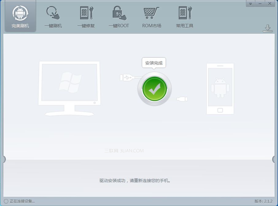 安裝驅動中,耐心等待。完成後會再提示連接上手機設備,確認連接後點擊確定按鈕,進行刷機了。